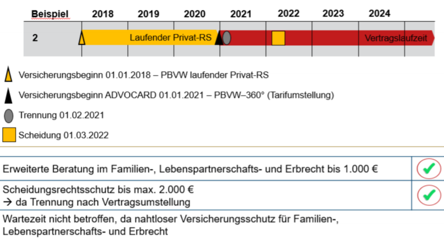 Vorsorgliche anwaltliche BeratungDer Kunde hat Versicherungsschutz im privaten Bereich bis 1.000 € pro Versicherungsjahr – auch ohne konkreten Rechtsschutzfall – auch bei nicht versicherten Rechtsschutzfällen.Die vorsorgliche anwaltliche Beratung ist mitversichert in ADVOCARD-360°-PRIVAT und gilt damit für den privaten Bereich des Versicherten.Statt einer Wartezeit gilt im Rahmen der vorsorglichen anwaltlichen Beratung eine 3- monatige Sperrfrist. Es besteht für alle Aktivitäten des Anwalts erst Kostenschutz, wenn der Anwalt in der betreffenden Angelegenheit erstmalig drei Monate nach Versicherungsbeginn aktiv geworden ist. (Im Unterschied zur Wartezeit spielt bei der Sperrfrist keine Rolle, wann der Versicherungsfall eingetreten ist.)Die Inanspruchnahme der persönlichen anwaltlichen Beratung und ggf. weitergehende Tätigkeiten des Rechtsanwalts wirken sich auf den Schadenfreiheitsrabatt aus und es fällt die gewählte Selbstbeteiligung an.