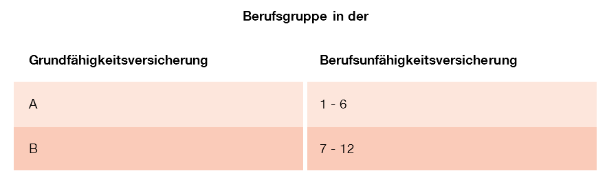 Die Entsprechungen zwischen den Berufsgruppen der Grundfähigkeitsversicherung und der Berufsunfähigkeitsversicherung zeigt die folgende Tabelle: