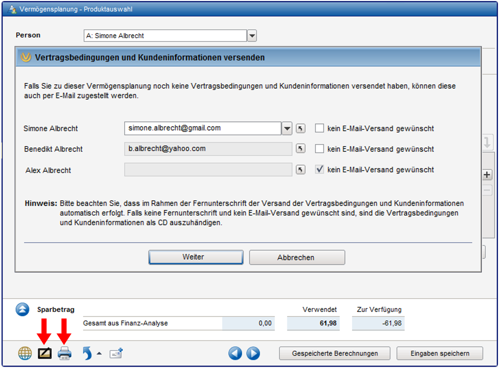 Im aktuellen Antragsverfahren werden dem Kunden vor seiner eigentlichen Vertragserklärung die Vertragsbedingungen und Kundeninformationen als Produkt-CD oder in Papierform ausgehändigt. Ab dem 01. April 2021 besteht zusätzlich die Möglichkeit dem Kunden diese Informationen per E-Mail zukommen zu lassen. Der Versand wird spätestens mit dem letzten Tarifierungsschritt, d.h. dem Ausdrucken oder Übertragung auf das iPad/den Windows Client automatisch ausgelöst. (s. Screenshot 1). Zuvor kann der Vermögensberater den Versand manuell durch Betätigen eines Versandbuttons in der DVAG Online-KI auslösen (siehe Screenshot 2).