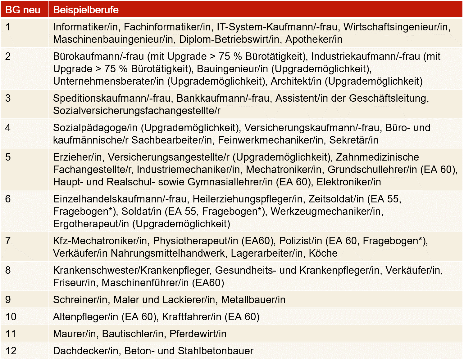 Die Eingruppierung der Berufe in die neuen Berufsgruppen richtet sich nach dem jeweiligen Berufsunfähigkeitsrisiko des Berufs. Hierbei sind neben den Erkenntnissen der Rückversicherer und Veränderungen ganzer Berufsbilder auch unsere Erfahrungen zu Schadenfällen unterschiedlicher Berufe eingegangen. Daher erfolgt die Berufsgruppeneinstufung nicht nach einer festen Überleitungsformel (z. B. alle Berufe der alten Berufsgruppe 3 wandern in die neue Berufsgruppe 5).